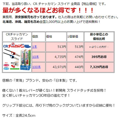 北海道、沖縄、離島も含め全国3,000円以上のお買い上げで送料無料! CRチャッカマンスライド個数価格1個単価最小単位との価格比較1本513円513円←より↓の方が…10本4,735円474円395円お得100本43,971円440円7,329円お得 買い物かごに他商品を入れないで下さい。