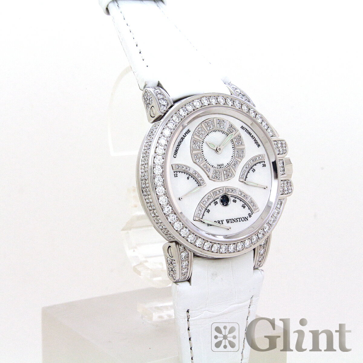 ※こちらは純正のハリーウィンストン オーシャン トリレトロ 18KホワイトゴールドモデルにダイヤモンドをカスタムしたOCEACT44WW002(400/MCRA44WL.MD/D3.1)仕様のモデルとなります。